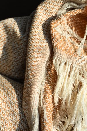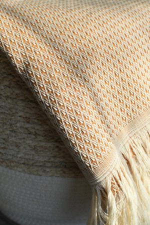 Nous fabriquons notre plaid aux motifs sablier jaune safran à franges écru dans le Tarn (81).Large de 180cm pour 220 cm de long (largeur du métier à tisser). Il est tissé sur une chaîne en coton naturel écru et tramé avec une laine jaune-orangé, recyclée aux Filatures du Parc à Brassac (81) . Son motif qui rappelle un sablier provient du type d’armure utilisé pour son tissage. Nous avons étudié sa grande taille de 180cm X 220cm pour une couverture complète du corps ou comme élément de décoration type couvre lit (pour un lit d’une largeur de 160 pour obtenir de belles retombées).