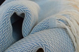 Nous tissons nos plaids sur une chaîne en 100% coton écru biologique, ou recyclé à 40%. Nous utilisons des armures différentes pour obtenir un large choix de motifs: diagonale, brisé, sablier à vous de choisir!