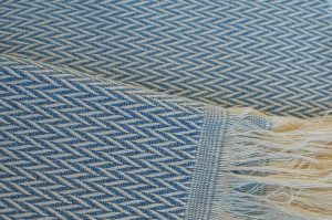 Notre plaid chevron bleu à franges écru est fabriqué en France, en 180cm de large pour 220 cm de long (largeur du métier à tisser). Il est tissé sur une chaîne en coton naturel écru et tramé avec une laine bleu ciel recyclée aux Filatures du Parc à Brassac (81) . Son motif en ligne zig-zag ou w appelé « chevron », provient du type d’armure utilisé pour son tissage. Nous avons étudié sa grande taille de 180cm X 220cm pour une couverture complète du corps ou comme élément de décoration type couvre lit (pour un lit d’une largeur de 160 pour obtenir de belles retombées).