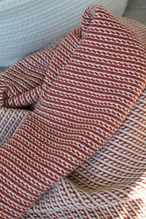 Nous fabriquons avec passion notre plaid Diagonale rouge en coton et laine recyclée, en France, dans le Tarn (81).
