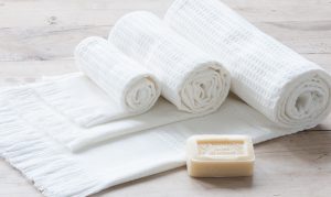 Notre serviette blanche 100% coton est une serviette au tissage nid d’abeille ultra absorbante.