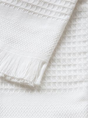 Vous reconnaitrez facilement notre serviette nid d’abeille en coton grâce à son liteau médaillon losange et ses franges écru.